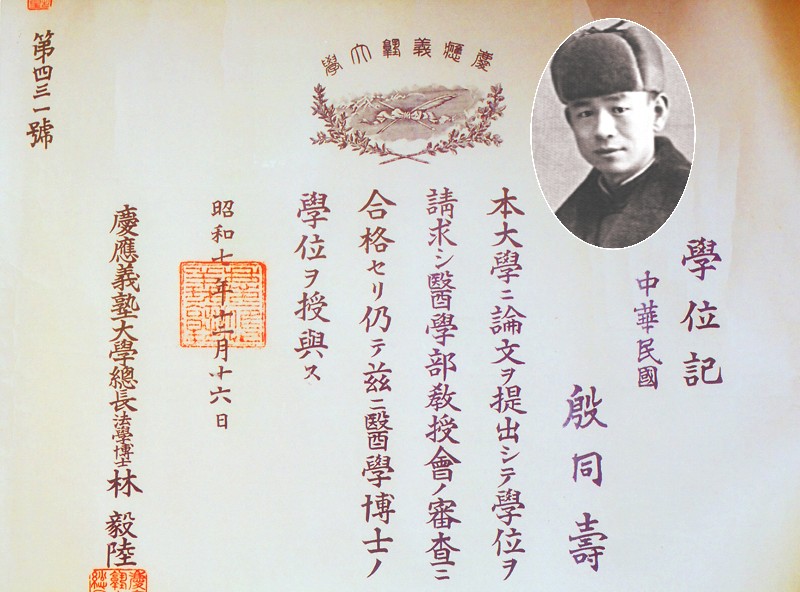 殷希彭是我校優(yōu)秀畢業(yè)生,到日本慶應(yīng)大學(xué)醫(yī)學(xué)部留學(xué),獲得博士學(xué)位后回校擔(dān)任病理學(xué)主任、教授。 殷同壽(即殷希彭)的醫(yī)學(xué)博士學(xué)位證書