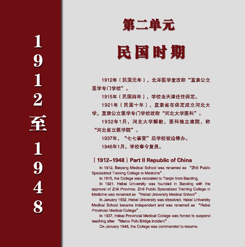In January 1932, Hebei University was dissolved. Hebei University Medical School became independent and was renamed as “Hebei Provincial Medical College”.